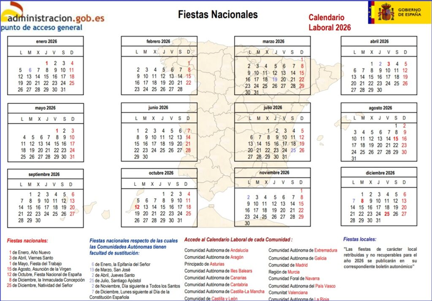 El Estatuto de los Trabajadores (art. 37) prevé un total de 14 días festivos anuales, retribuidos y no recuperables. En cada ejercicio deben respetarse las fiestas nacionales no sustituibles, que en 2026 son las siguientes:
