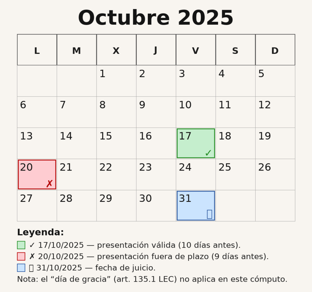 – ✗ 20/10/2025 — presentación fuera de plazo (9 días antes del juicio).